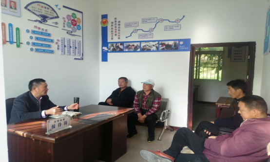 图为:将军村支部书记在乡贤说事室为乡贤人员开展政策宣讲