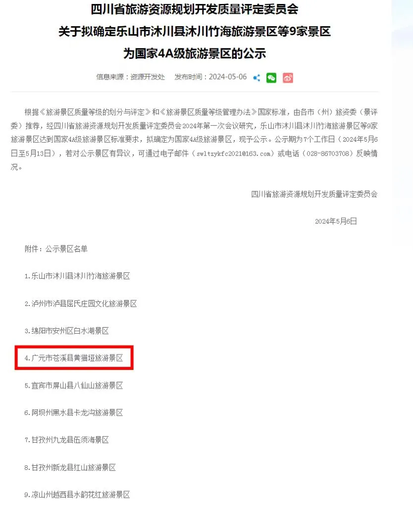 近日,四川省文化和旅游厅官网公布,根据《旅游景区质量等级的划分与评定》和《旅游景区质量等级管理办法》国家标准,由各市(州)旅资委(景评委)推荐,经四川省旅游资源规划开发质量评定委员会2024年第一次会议研究,乐山市沐川县沐川竹海旅游景区等9家旅游景区达到国家4A级旅游景区标准要求,拟确定为国家4A级旅游景区,现予公示。苍溪黄猫垭旅游景区名列其中。