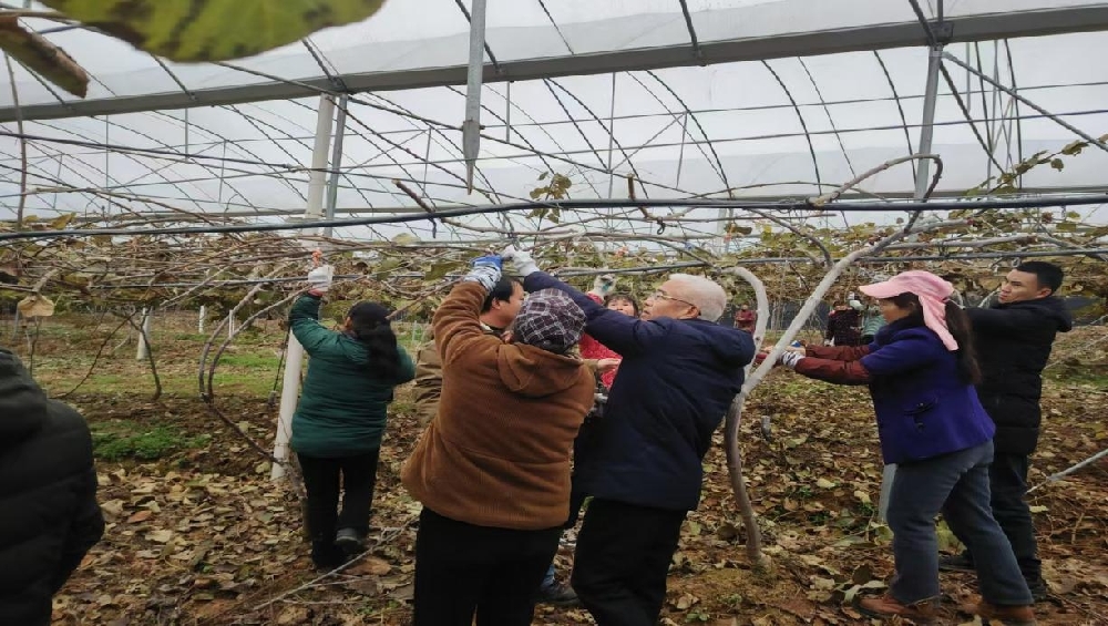 首席专家、公司技术顾问吴仕权教授亲临现场指导,园区管理人员和数十名工人,他们手拿剪刀,手臂套满绑枝带,按照技术要求,紧张有序的对花粉基地内雌株进行越冬修剪。修剪配备适宜的结果母枝,并对病枝、衰弱的结果母枝进行剔除,亩留芽量控制在2万芽左右,按40公分间距均匀分布在架面并用专用绑枝带固定牢固,所剪剪口安排专人使用油漆封口锁住树体养分,同时采取清园措施,使用浓度5%石硫合剂全园喷洒,起到消毒杀菌的作用。另外,整个园区做好防冻保暖措施,用防风布覆盖猕猴桃园四周,真正做到了“头顶戴帽子、身上穿袄子、脚下穿鞋子”,保证猕猴桃安全过冬。