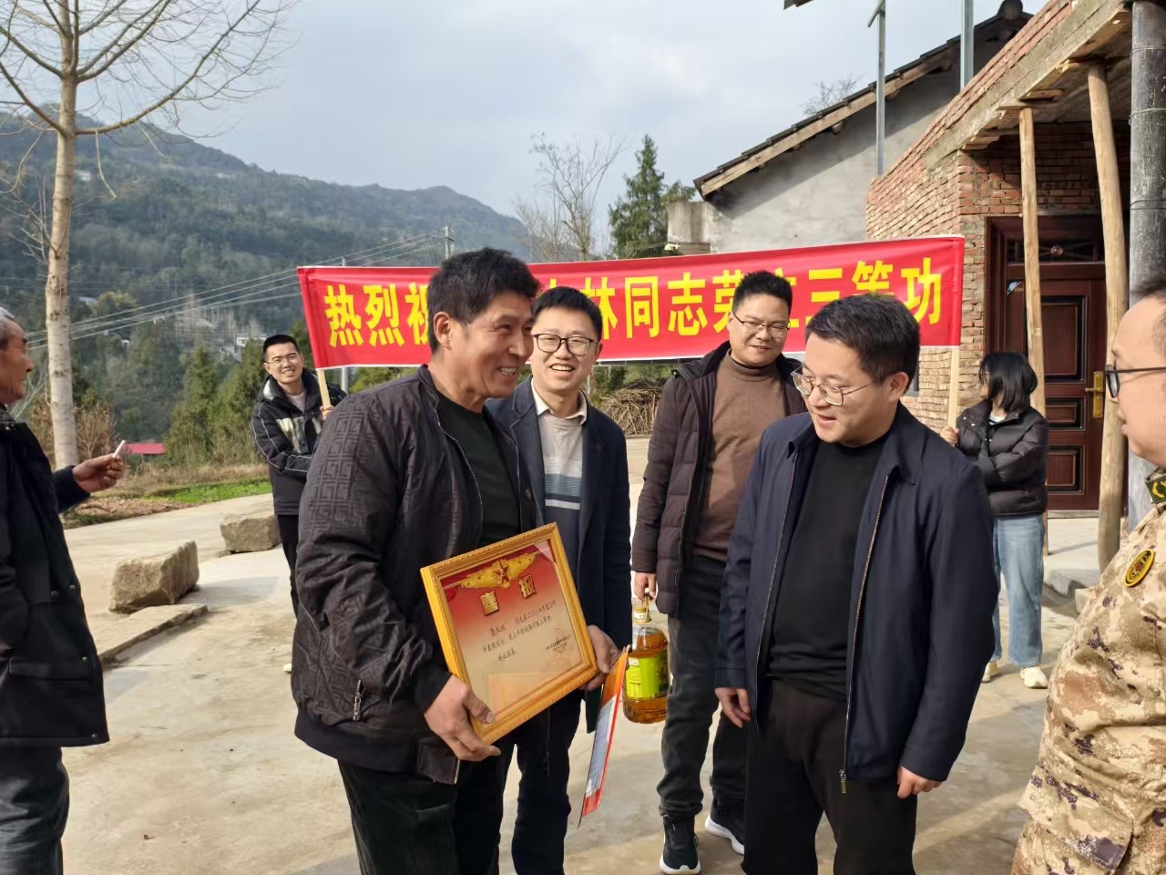 为进一步弘扬拥军优属的光荣传统,增强军人军属的荣誉感和自豪感,2月27日,河地镇主要领导带领镇人武部、退役军人服务站工作人员,前往兴华村、榨垭村、龙固村,为荣立三等功的现役军人龚木林、王逍、何义平家庭送去立功喜报及慰问品。