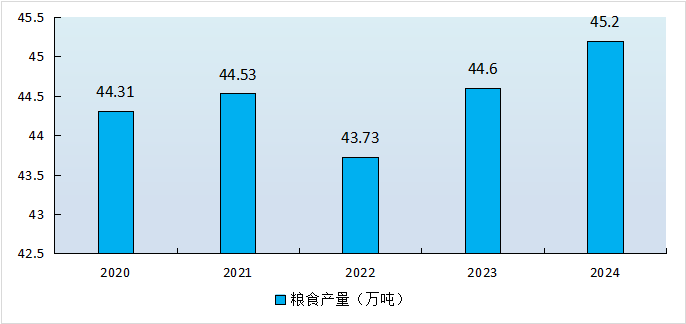 全年粮食作物播种面积120.82万亩,比上年增长0.2%。其中:小春粮食播种面积37.67万亩,增长0.8%;大春粮食播种面积83.15万亩,下降0.2%。经济作物中:油料种植面积45.38万亩,同比增长4.1%;水果种植面积24.4万亩,同比增长0.2%;蔬菜及食用菌种植面积15.77万亩,同比增长2.7%。