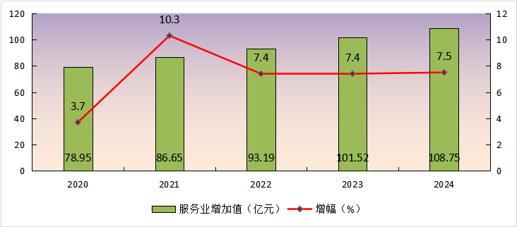 全年实现服务业增加值108.75亿元,比上年增长7.5%。分行业看,批发和零售业、其他服务业、住宿和餐饮业、金融业、交通运输仓储和邮政业、房地产业增加值分别增长10.2%、9.2%、7.1%、5.8%、4.4%、1.3%。全年规模以上服务业企业营业收入增长12.7%。