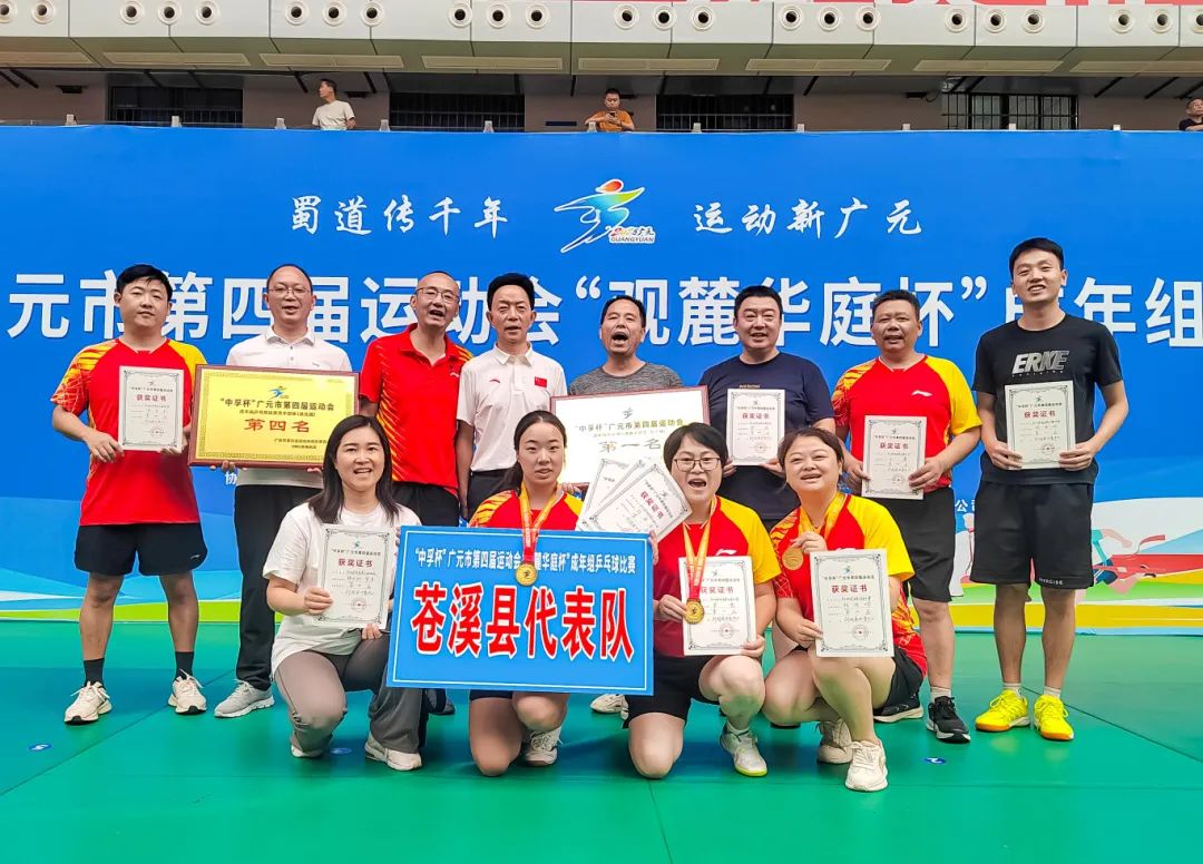6月18日至22日,苍溪县乒乓球代表队参加了“中孚杯”广元市第四届运动会成年组乒乓球比赛。代表队队员们团结协作,顽强拼搏,取得县区组女团冠军、男团第四名、混双第四名,钱滢吟获女单亚军,何春容、罗雯分获第四名和第六名,被组委会授予“体育道德风尚奖”。