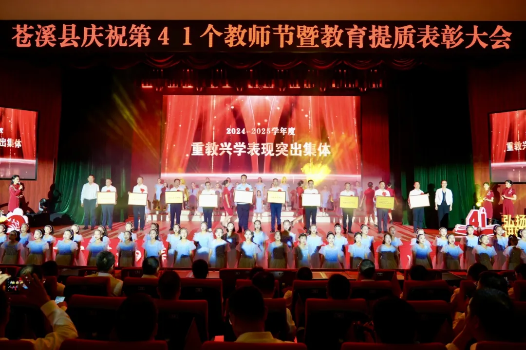 表彰大会上,张世忠、李汀、谢龙飞、赵丹、梁赛等县领导分别为教育质量表现突出集体,优秀班主任、优秀教师代表,第三届苍溪好老师代表,重教兴学表现突出集体代表、重教兴学表现突出个人代表颁奖。