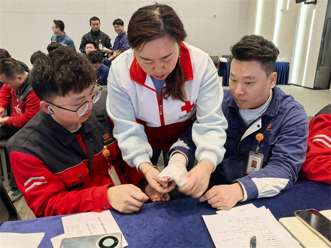 1月13日上午,通威绿材(广元)培训教室内座无虚席。在苍溪县红十字会专业讲师的带领下,60余名企业员工分组开展心肺复苏实操训练——按压深度、频率、手法,每一个环节都要求严格规范。“手臂打直,用上半身发力!”培训师穿梭在学员之间,逐一纠正动作细节。一旁的AED训练设备同步传来清晰提示音:“请贴好电极片……开始分析心律……”紧张有序的课堂氛围中,一场关乎生命守护的实战化训练正扎实推进。
