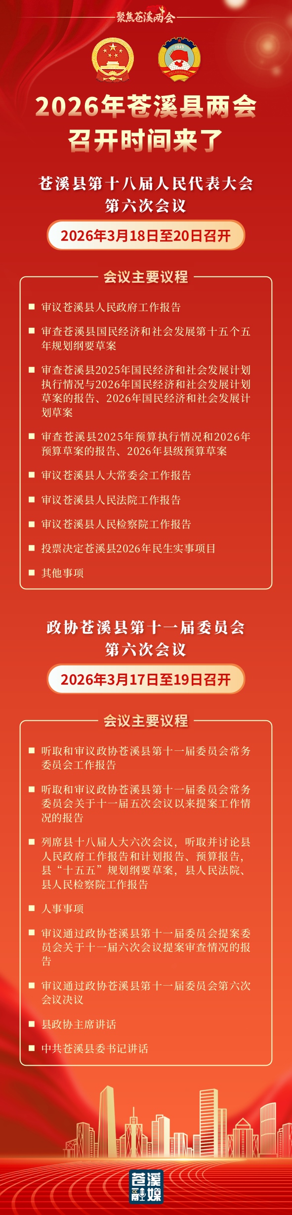 经政协苍溪县第十一届委员会常务委员会第二十次会议决定,政协苍溪县第十一届委员会第六次会议于2026年3月17日至19日在县城召开,会期3天。