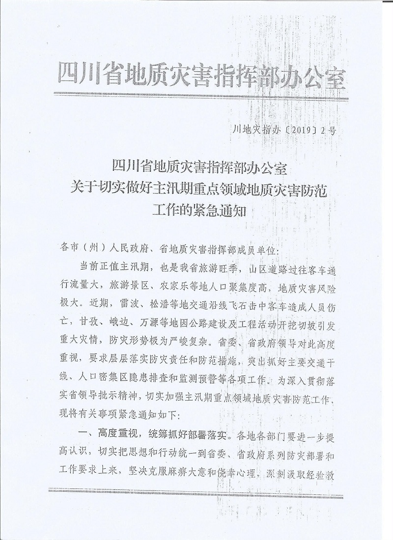 附件:四川省地质灾害指挥部办公室《关于切实做好主汛期重点领域地质灾害防范工作的紧急通知》(川地灾指办〔2019〕2号)